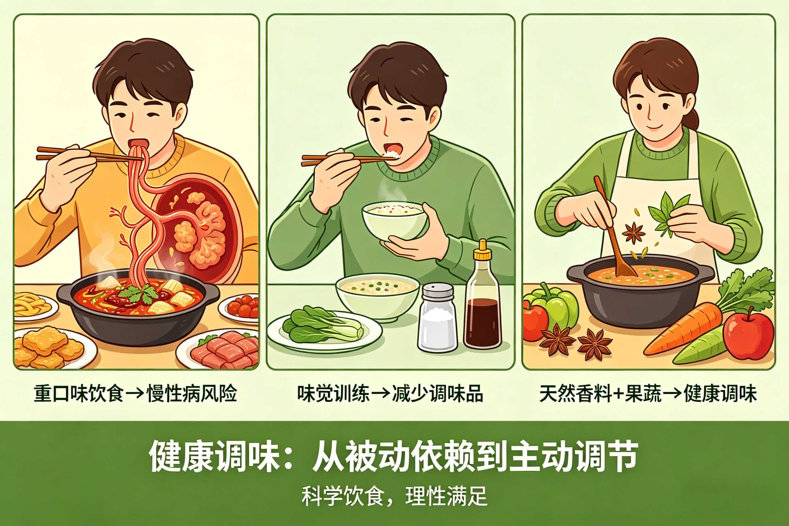 长期偏爱重口味,尤其是高盐、高油、高辣饮食,是高血压、心血管疾病等慢性病的重要风险因素。理解其成因后,我们不应一味抑制,而应有意识地进行“味觉训练”:逐步减少调味品使用,多用天然香料提味,增加膳食中果蔬比例,让敏感的味蕾逐渐适应并欣赏食材的本味。