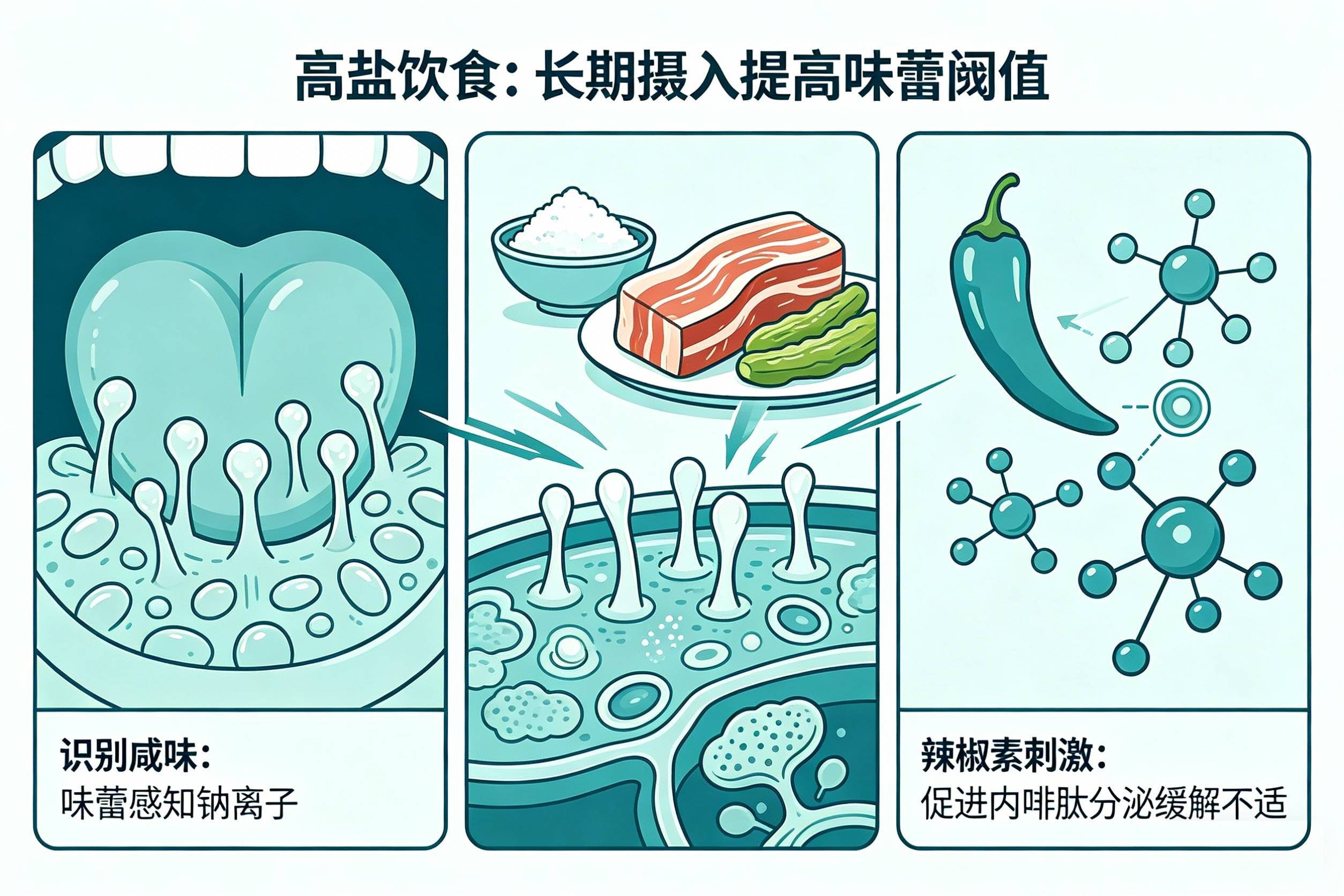 从进化角度看,盐(钠)是维持生命活动不可或缺的元素,人类天生具备识别和偏好咸味的能力,以确保摄入足够电解质。长期高盐饮食会逐渐提高味蕾对咸味的敏感阈值,导致口味“越吃越咸”,形成生理依赖。此外,辛辣食物中的辣椒素能刺激内啡肽分泌,产生轻微愉悦感,成为一种特殊的生理奖励。